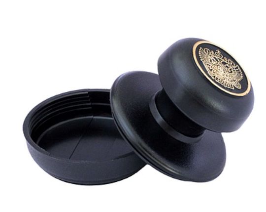 Внутри оснастки расположена синяя штемпельная подушка. При нажатии печать окрашивается. Клише изготавливается из резины.